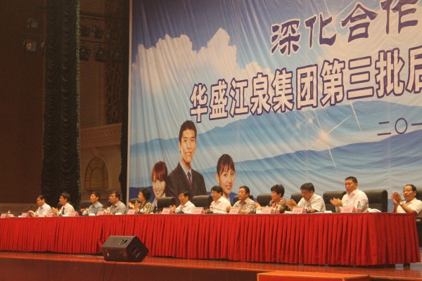 2013年6月7日華盛江泉集團第三批后備人才培訓班開班典禮在江泉城大酒店隆重舉行。華盛江泉城多功能廳人才薈萃,激情閃爍。出席開班典禮儀式的領導有:省人大教科文衛委員會副主任委員朱紹陽,臨沂大學黨委書記丁鳳云,羅莊區委副書記、區長趙曉輝,羅莊區委常委、副區長張玉軍,羅莊區人大副主任趙日坤,臨沂大學商學院黨委書記曹光杰,院長許汝貞,博士刁玉柱,沈泉莊社區黨委書記、居委會主任、華盛江泉集團副董事長王文濤,沈泉莊黨委副書記、華盛江泉集團總經理高洪路,沈泉莊黨委副書記、華盛江泉集團副總經理王廷寶以及集團所有高管、各單位管理人員和后備人才等。同時邀請了臨沂日報社、臨沂電視臺、臨沂大學及華盛江泉集團有關新聞媒體對本次典禮進行了實時報道。